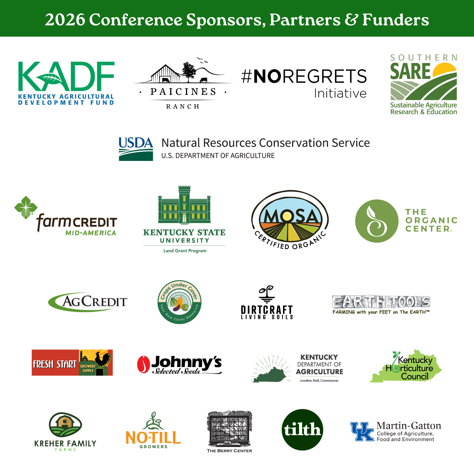Barn Raisers: Kentucky Ag Development Fund, Paicines Ranch and the #NoRegrets Initiative, Southern SARE, USDA Natural Resources Conservation Service Harvesters: Farm Credit Mid-America, Kentucky State University, MOSA Certified Organic, The Organic Center Seeders: Central Kentucky Ag Credit, University of Kentucky Entomology Department, Dirtcraft Living Soils, Earth Tools, Fresh Start Growers Supply, Johnny's Selected Seeds, Kentucky Department of Agriculture, Kentucky Horticulture Council, Kreher Family Farms, No-Till Growers, The Berry Center, Tilth Soil, University of Kentucky Martin-Gatton College of Agriculture, Food and Environment Farmer Friends: Cherokee Historical State Resort Park Friends